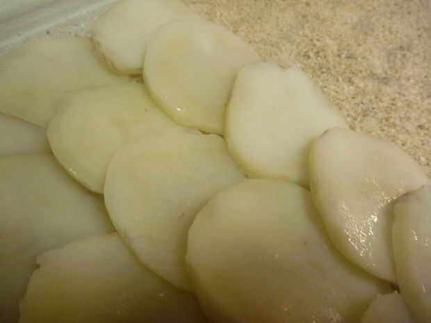 Tip: Apilar las patatas ligeramente superpuestas la rodaja anterior como se muestra en la imagen para evitar que la moussaka desmenuzarse más tarde.