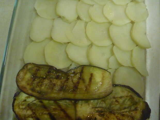 5. Coloque una capa de rodajas de berenjena en las patatas.