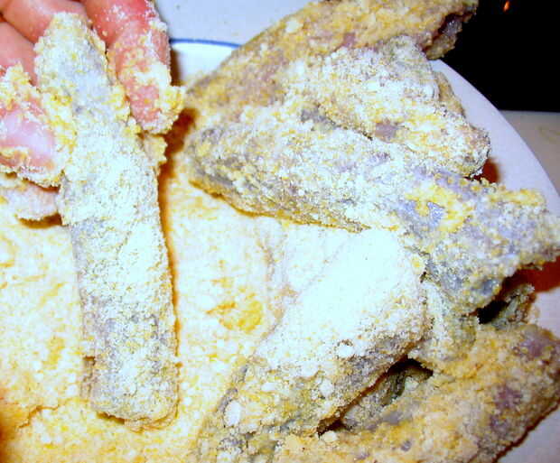 Cruce los segmentos en un poco de clara de huevo (la leche haría también) antes de dragado en una harina de maíz dulce y pimienta mezcla (realmente sólo segundito con algunos extra pimienta negra).