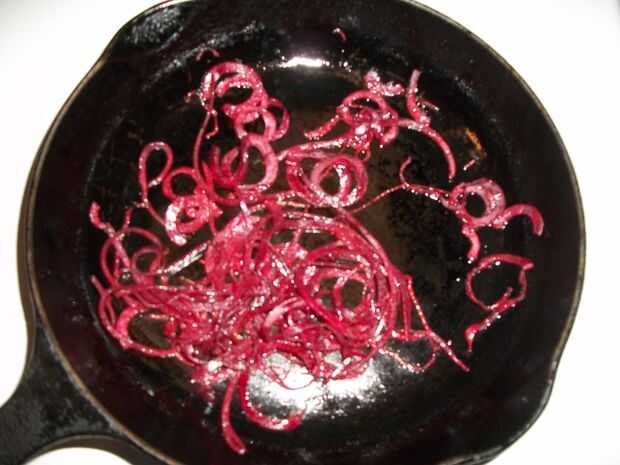 Poner la sartén sobre la parrilla a fuego alto con un poco de aceite y freír encima las rodajas de remolacha! (Estos los se hacen con spiralizer les da su delgada forma rizado pero fino rebanadas, el más delgado mejor, también funcionan bien y solo falta un poco más fría). Llegan nítidas y oscuras y se vuelven muy tocino como. Tan muy delicioso para agregar a la hamburguesa final. Confía en mí en esto.