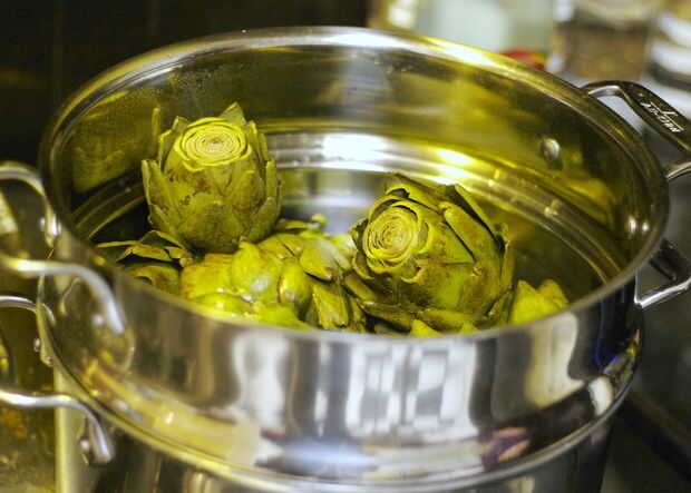 Punto de ebullición es también aceptable, pero filtra más vitaminas y minerales de las alcachofas y deja un poco empapado y más difícil de manejar. Si tienes un vaporizador, utilizarlo.