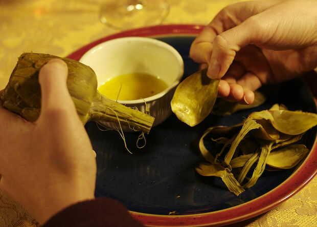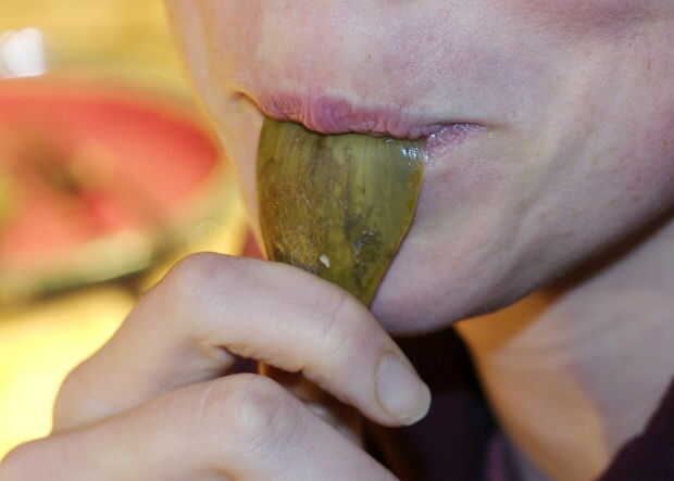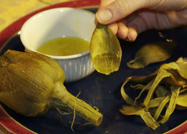 Quitar la hoja, sumergir en la salsa y ponga en su boca boca abajo para que el interior inferior parte sienta contra los dientes inferiores. Arrastre los dientes a lo largo de la hoja, raspar el tejido carnoso hasta el punto de fijación. Desechar el resto de la hoja, ya que es demasiado duro comer.