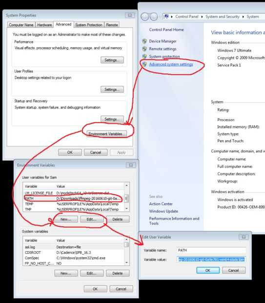 A continuación, para utilizar en la línea de comandos como necesitamos, tendremos que añadir el directorio que hemos extraído FFmpeg en a la variable PATH. Si no sabes dónde está la opción de modificación de esta variable, se puede encontrar navegando por Control Panel\System y Security\System y seleccionando Configuración avanzada del sistema -> variables de entorno