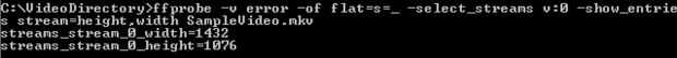 Esto nos dará una salida de dos líneas, la primera es la anchura del bastidor y el segundo es la altura. Si esta resolución es adecuada para sus necesidades, no hay ninguna necesidad de tomar ninguna otra medida, pero si se necesita una resolución más o menos grande, calcular la nueva altura que quieres que el vídeo se, lo que nos referiremos más tarde a [altura]. Tendrás que usar una opción adicional que aparece más adelante en el paso 4 para tomar ventaja de este conocimiento.
