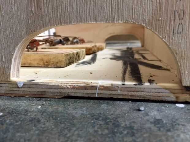 En los más pequeños trozos de madera, corté los agujeros de entrada para las ratas. Hizo una caja de 5 lados y une la parte superior con un conjunto de antiguo gabinete bisagras (cualquier bisagras estaría muy bien, están ahí para permitir el acceso a la caja).