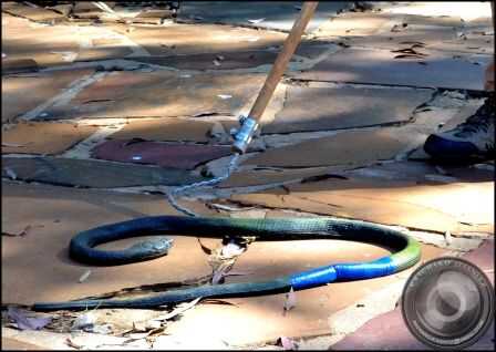 Comience moviendo su gancho pegue hacia la serpiente cerca de un tercio de la forma de la cabeza. (Casi todos los métodos de captura de serpientes implica repartir la serpiente en tres partes)