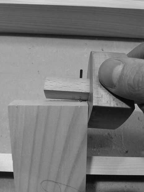 Juntas de cola de Milano comienzan con un alfiler media situado en el exterior de las articulaciones. Por lo general en trabajo fino sería 6mm > mm 9 en obra mayor como un pecho de herramienta de 10mm > 18mm sería aceptable. Fija tu gramil perno medio de su elección y marque los pernos de la mitad en las juntas de cola.