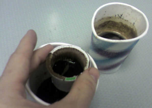 (Método alternativo es dejar los terrenos en la k-taza y Vierta lentamente el agua caliente del grifo a través de la Copa de la k. Esto toma más tiempo y es más fácil de propagarse de esta manera).