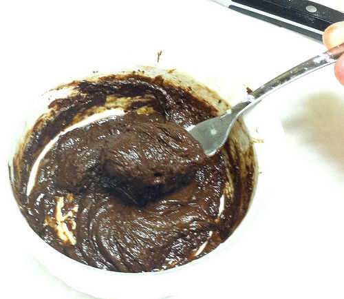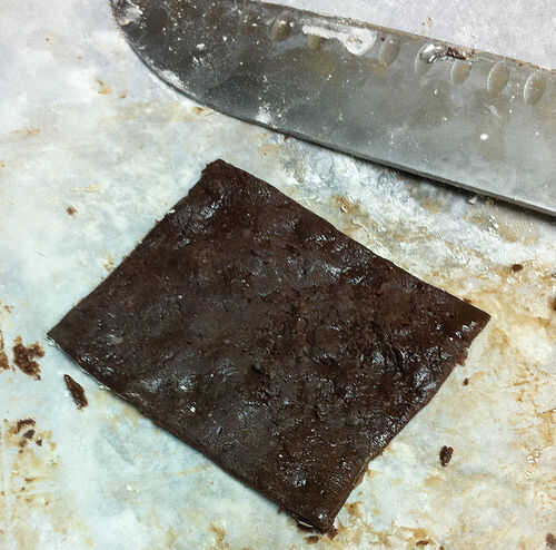 Foto 4. Áspero, ligeramente pegajosa arcilla chocolate semidulce; Esto es bueno bastante porque es para la parte inferior de los postres y los niños estaban empezando a entrar en materia por este punto, así que tuve que date prisa.