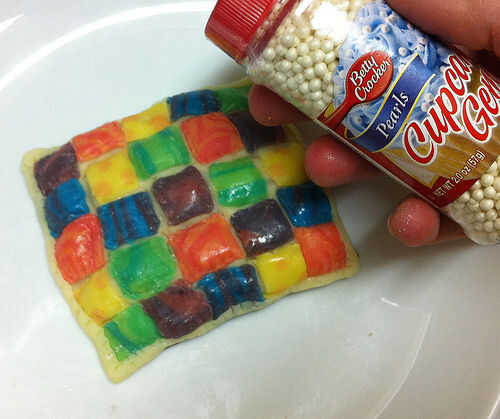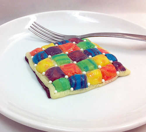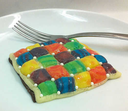 Después de colocar la colcha color encima el turrón, presiona en las intersecciones de los cuadrados con una brocheta de madera para anclar un poco más. He añadido pequeñas decoraciones de la Magdalena en las esquinas para la diversión, pero sería tan bueno sin salpicaduras.