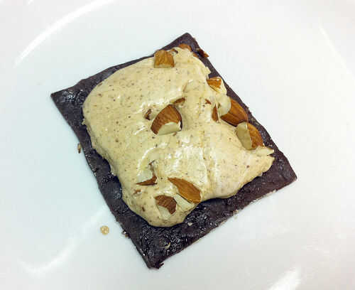 Foto 5. Turrón de mantequilla de almendras bonito con almendras picadas por encima. Esto haría una versión fabulosa de almendra de una barra de Snickers de imitación. Usé la receta de chow.com pero agrega sal un poco más y usar suave mantequilla de almendras en lugar de mantequilla de cacahuete crujiente.