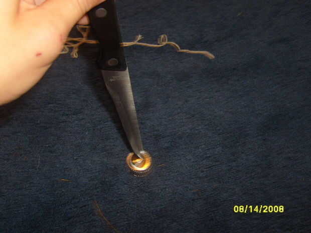 Continuación tendrá un cuchillo del filete poner un agujero en la tapa de la botella.