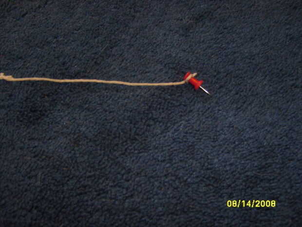 Continuación tendrá una tachuela e hilo de cadena. Ate el cuerda/hilo alrededor de la tachuela.