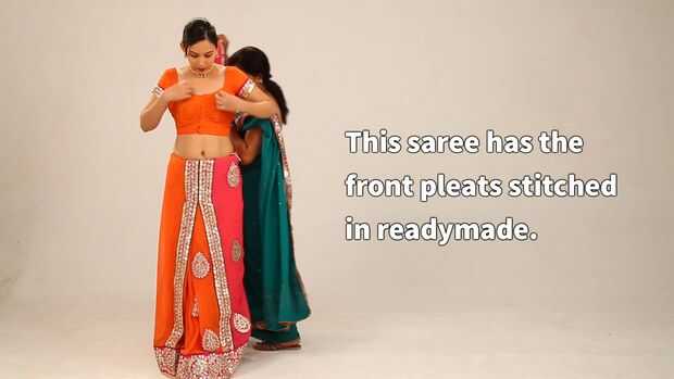 Esta sari tiene los pliegues frontales cosidos en Ready-Made. Poner alrededor de la cintura a la parte posterior, tuck completamente mientras haciendo lo mismo. Llevarla hacia el doblez delantero la sari.