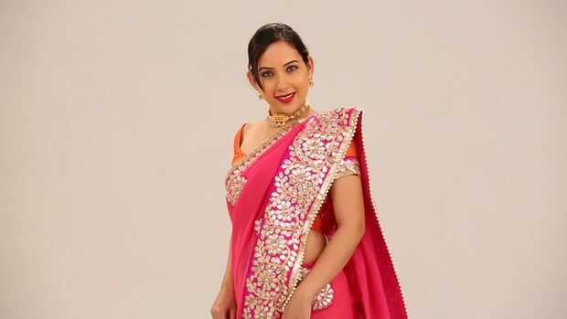 Sari de Punjabi estilo drapeado paso a paso-Usar un sari de la gasa o del georgette, para este método. Meta el extremo de la sari (no pallu final) en el lado derecho y llevarlo alrededor de la cintura a la parte posterior, tuck completamente mientras