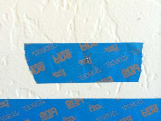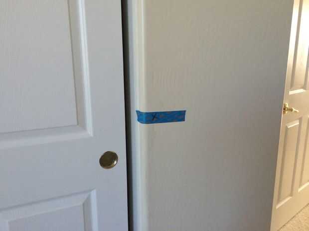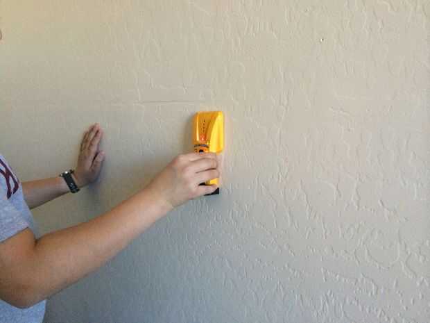 Encontrar 2 pernos en paredes opuestas con el studfinder, preferiblemente 10' - 11' aparte. Poner cinta adhesiva sobre las manchas y hacer una marca en la cinta con un lápiz.