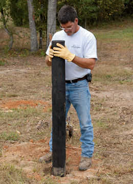 Línea a lo largo de la línea de centro vertical del poste de bisagra de la puerta. También utilice este paso para ubicar la posición de la bisagra inferior. Si el suelo no es nivel, asegúrese de que el extremo de la puerta es lo suficientemente alto de la tierra para permitir la libre circulación. Puede utilizar cuerdas atadas a las clavijas para establecer una línea recta y una altura de nivel.