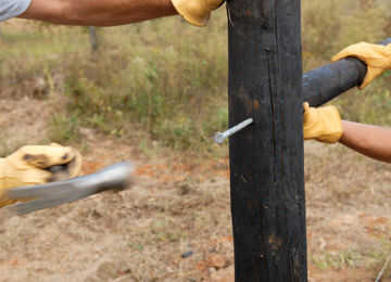 Haga agujeros en el poste de la bisagra, así como el primer alambrado y en el principio de ambos extremos del soporte del poste. Unidad 12 pulgadas galvanizados picos en los dos agujeros. Para dar apoyo fuerte a la puerta y la esgrima, asegúrese de añadir longitudes de alambre del filtro para el primer par de postes a ambos lados de las puertas. Estas son wiresâ tirado firmemente por un strainerâ montado diagonalmente entre el poste de la bisagra y la primera valla. El cable de filtro equilibra la presión descendente ejercida por la puerta y el exterior, tirando de la presión del fenceline.
