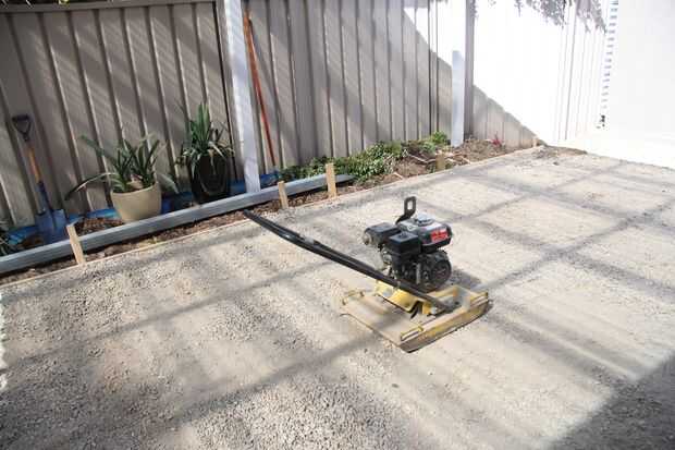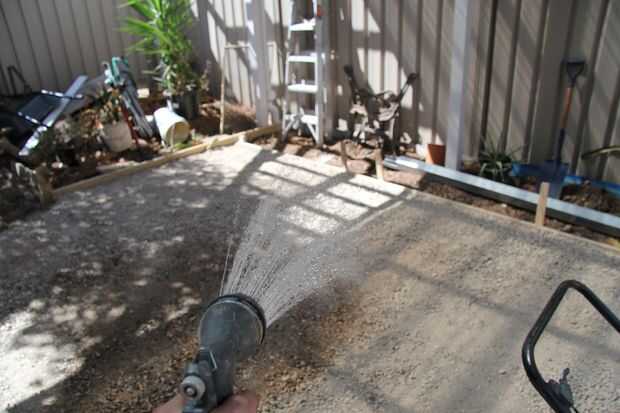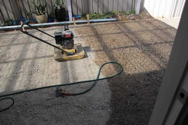 Una vez que estaba feliz con los niveles que podría empezar la compactación. Esta fue mi primera vez utilizando un compactador y son sorprendentes fácil de manejar. El primer paso es rociar ligeramente por el camino con agua para atrapar el polvo y enlazar con las piedras, luego circulan por toda la zona con el compactador. Repetí este paso 5 veces, regando entre cada uno.
