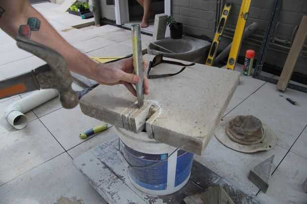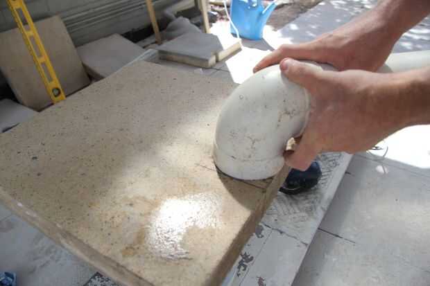 Empecé con la pavimentadora que cabría alrededor de la bajante del canal. Esto requirió un 90mm redondo muesca. Medido donde el centro de la tubería sería de la tierra y entonces utiliza una pieza de 90mm de acoplamiento para marcar el corte.