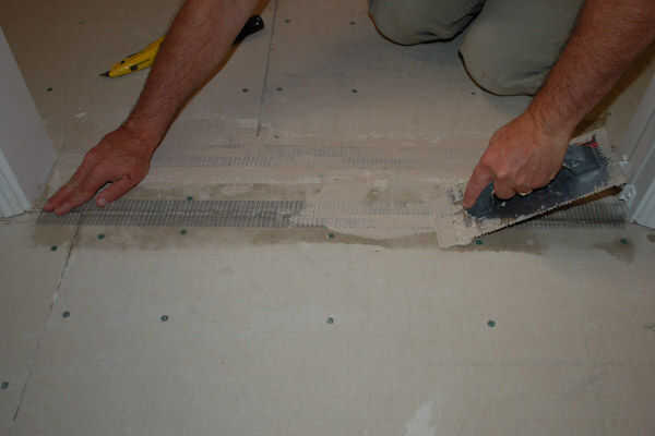 Repartidas tablero robusto usando la paleta de mezcla de hormigón.  Asegúrese de que esparza una capa gruesa de 1/4 de pulgada uniformemente en toda el área, para que los azulejos ponen uniformemente sobre el piso.