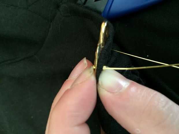 Para hacerlo bien, sostenga un dedo asegurando la parte plana superior del headpin contra la parte frontal decorativo de la hebilla de la capa. Pizca de esto y la tela juntos en la espalda, (ver imagen) y luego, usando la uña del pulgar, sostenga la miga bien como mucho hasta el fondo como usted puede. Ahora, puede utilizar la otra mano para utilizar la herramienta que prensa y sofocar la encrespadura.