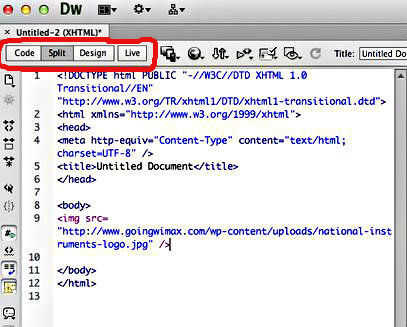 En Dreamweaver, seleccione el modo "Split" (un círculo rojo).