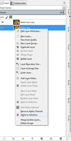 seleccionar la capa inferior en el cuadro de diálogo de capa y luego haga clic y desplácese hacia abajo hasta encontrar "agregar alfa a selección".