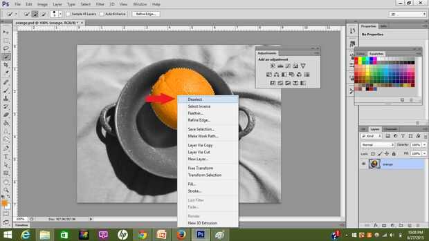 Cuando colorante naranja, haga clic en la herramienta de selección rápida, luego haga clic derecho sobre la naranja. Aparecerá un menú desplegable. Haga clic en "anular la selección".