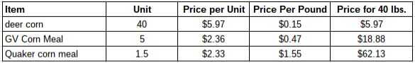 Así que ¿cuál es la diferencia entre el maíz verdura que comer tú y yo y el maíz de campo a los pollos? No mucho, de hecho es perfectamente aceptable para comer el grano de maíz de la bolsa; sin embargo es un poco difícil (maíz las tuercas a alguien). Cuando lo haga la matemáticas seis dólares una bolsa es una ganga en comparación con el maíz de los productos y departamentos de congelados en el supermercado. Hice una pequeña comparativa para mostrar el valor de una bolsa de maíz venado en Walmart en comparación con productos de maíz común, y ninguno de ellos se acercan incluso al precio por libra de maíz venado.