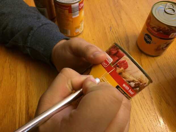 Idealmente se invierta una lata y meter algunos agujeros (para que el aire hacia fuera una vez sumergido) y una arandela de goma y un tornillo para conectar la lata y los alimentos del tazón de fuente para que el bolo alimenticio se suspende en el ce