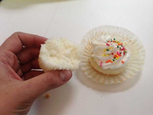 Retire el papel de la Magdalena, a continuación, gire suavemente la parte inferior de la Magdalena. Se puede utilizar un cuchillo, pero... Por qué te pierdas la oportunidad de lamer el pastel en los dedos.