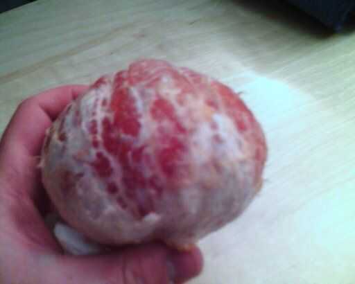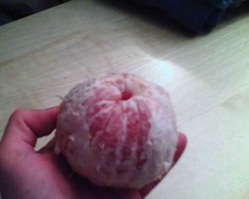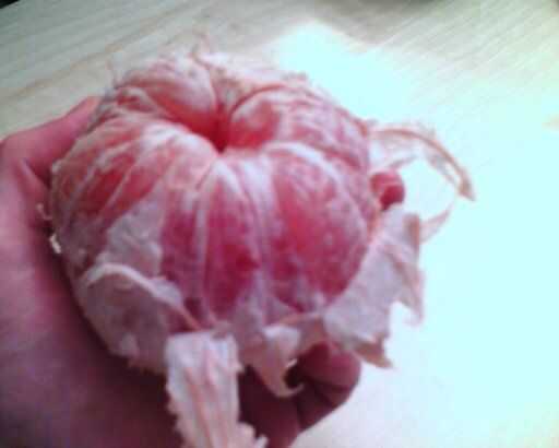 Agarrar a la echada cerca de la parte superior de la fruta, como se indica en la nota de la imagen a continuación. Si usted tiene cuidado, usted puede en realidad Pele la médula, como se ve en la segunda imagen. Por lo general, sólo se pueden conseguir más de la mitad superior de la médula con este método.