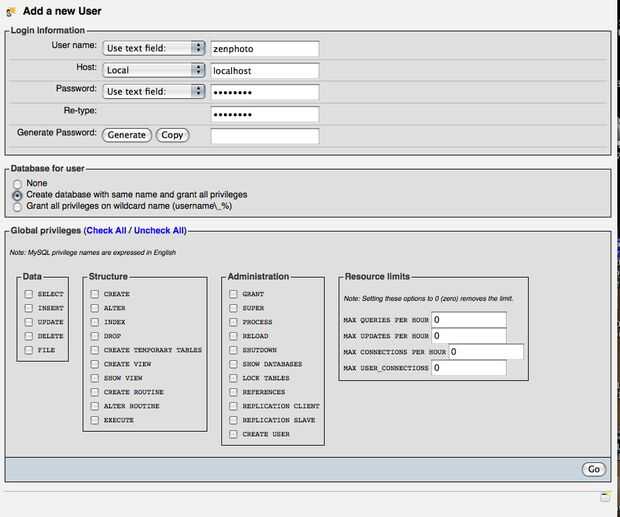 Puesto que estamos creando una tabla de este usuario que tiene acceso completo a, solo utilice eso para zenphoto