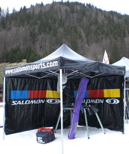 Los marcos de la tienda del pabellón al aire libre portable de aluminio son considerados de la línea de composición. El marco es ligero, robusto, diseñado para resistir las más difíciles condiciones climáticas o ambientes. Un marco de aluminio típico de 10'x 10' se peso sobre 40-50 libras2" patas hexagonales gruesas proporcionan soporte premium en comparación con las piernas de la tradicional forma cuadrada. Otras características principales incluyen reforzado conectores de fibra de vidrio y reforzados interiormente del braguero. El chasis de aluminio es generalmente más caro que un marco de acero de la tienda.