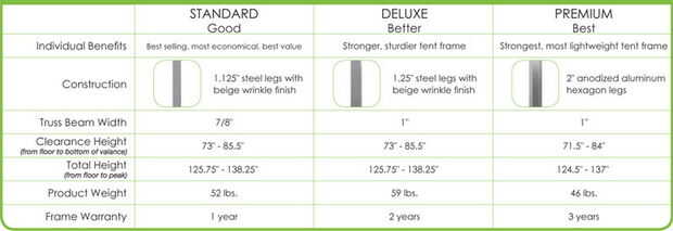 Nuestros marcos de acero tienda de pabellón al aire libre portable son robusto y económico, ofreciendo el mejor valor en el mercado actual. El marco es más pesado que sus contrapartes de aluminio, un típico 10'x 10' acero marco pesará sobre 55-75 libras. El marco de acero características 1.125-1.25" patas cuadradas gruesas, pero patas hexagonales están disponibles con ciertos modelos de la tienda.