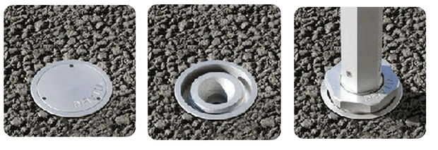 Para una mayor solución permanente, también tenemos un exclusivo sistema de anclaje. Se perfora un agujero en el suelo duro y los anclajes de la tienda están protegidos dentro del agujero. La tienda está montada encima de estos anclajes.