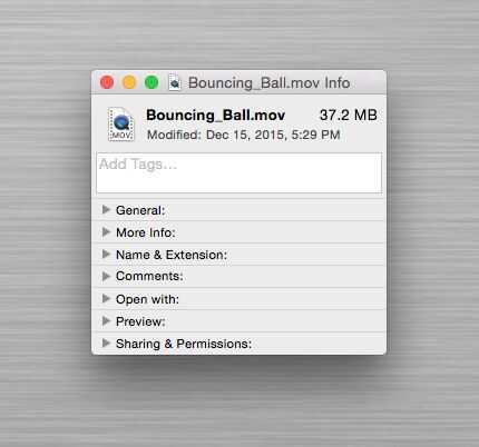 Comenzar haciendo clic derecho el icono de tu video. Esto debe tirar para abrir un menú. Haga clic en "Obtener información" y una ventana aparecerá con un montón de información sobre el archivo. Este video en particular es de aproximadamente 37,2 MB.