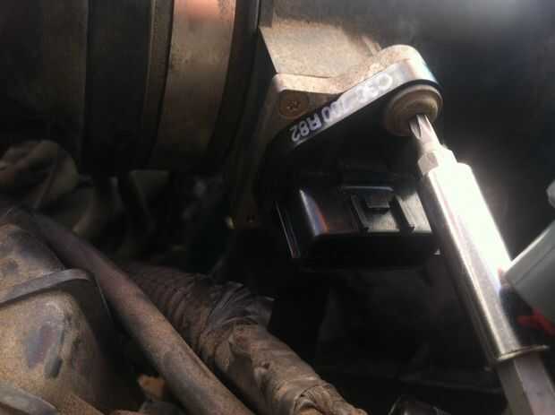 El MAF sensor se conecta a la manguera de entrada de aire que discurre entre el filtro de aire y entrada de aire de su coche usando dos tornillos de torx de seguridad.  Desenroscar los tornillos de torx con el destornillador de torx de seguridad.  Estos tornillos son similares a tornillos torx regular excepto que también tienen un pequeño cilindro en forma nub que sale la mitad.  Un poco de torx de seguridad tiene una hendidura para caber sobre este pedazo.  Usted puede encontrar un conjunto de estos baratos (debajo de $10 en un almacén de autopartes).  Sólo he tomado prestada de TechShop. Uso la cabeza plana Destornillador para apalancar el MAF de la carcasa un poco.