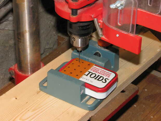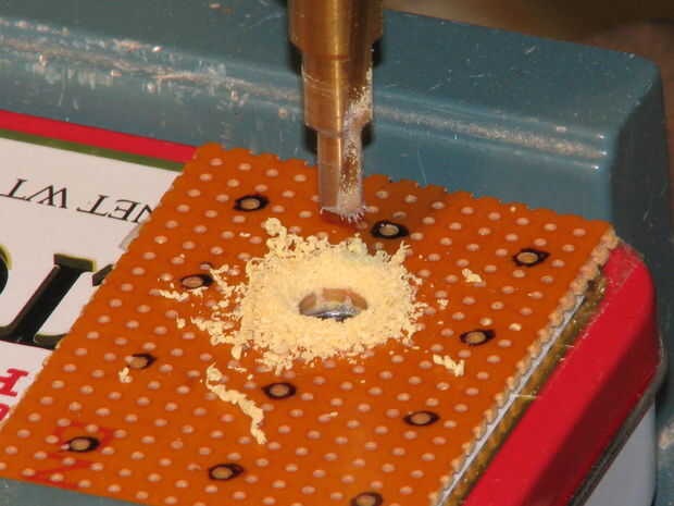 2) utilizando la broca pequeña, taladre orificios guía a través de los puntos marcados. Usar una broca afilada a una velocidad lenta del taladro para esto y aplique presión solo muy ligera. Los agujeros de la veroboard le permiten centrar la broca exactamente antes de perforar.