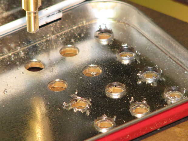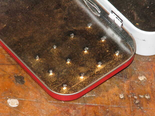 Ahora debería tener una lata Altoids con una matriz de 12 agujeros perfectamente alineados y perfectamente limpios, que su matriz de LED se ajusta a la primera vez.