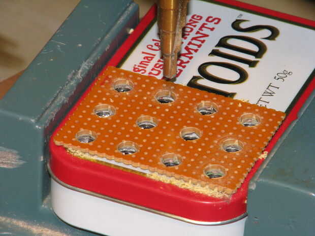 1) Marque la matriz de agujeros en la veroboard, poner tiras de cinta de doble cara en el otro lado y pegan esto centralmente en la parte superior de la lata. Todo apriete firmemente, pero no tan fuerte como para distorsionar la lata.
