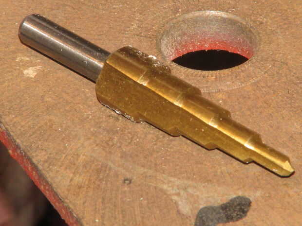 3) Utilice la broca de paso, otra vez a velocidad lenta, para agrandar los agujeros para 6 mm (1/4 ").