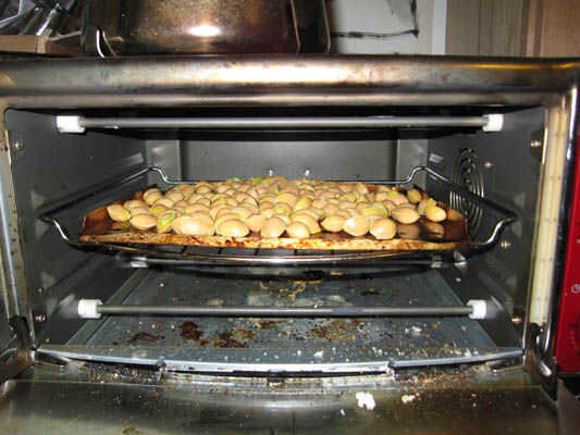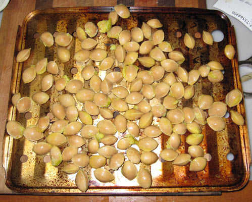 Enjuagar las tuercas una última vez y ponerlos en una bandeja para hornear galletas.  Ponerlos en el horno para secar a 180 grados (80 grados Celsius) durante 30 a 60 minutos.  Están listas cuando las cáscaras blancas estén secas.  Se puede almacenar en un frasco hermético durante meses.