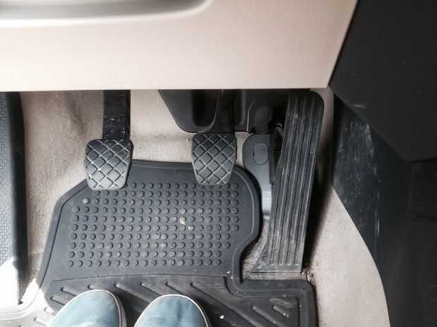 Observe que hay tres pedales en los pies ahora en vez de dos. El pedal más lejos a la izquierda se conoce como el "embrague" y es fundamental para aprender a conducir un manual. [IMAGEN]