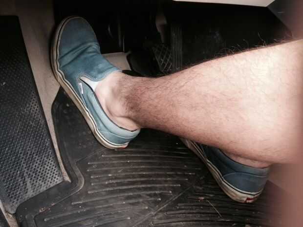 Con el coche y en neutral, presione el embrague hasta el piso y manténgalo ahí [imagen del pie]. A continuación mueva la palanca de cambio en la posición "1", primera marcha, manteniendo el pie en el embrague. [Imagen del coche en marcha 1 º]