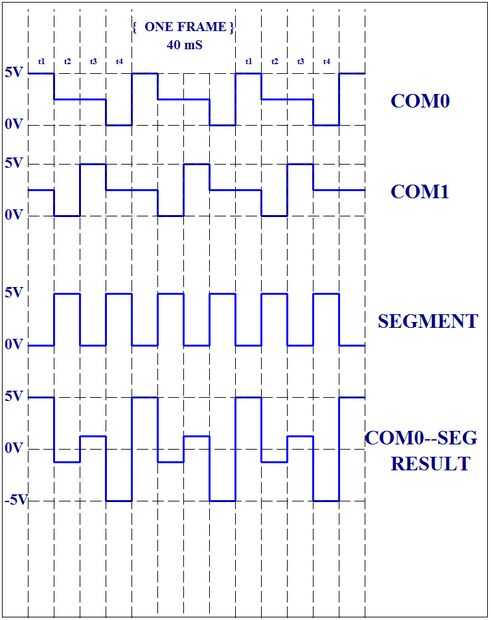 Los segmentos requieren Vcc o GND. A pesar de solamente voltajes DC presente WRT (en relación con) Gnd, los segmentos ver AC de la presentación de las tensiones en el momento adecuado (COM WRT SEG). Si se conecta el ' alcance tierra a un pin de la SEG y la sonda a un pin de COM se verá la forma de onda AC resultado. La corriente alterna proviene de la SEG en lo referente a COM0. Imagina poner el cable de negativo de un voltímetro a la SEG terminal y el positivo a COM0. En t1 el medidor leerá + 5 VDC (0V y 5V). Ahora en t4 el medidor leerá-5VDC (5V y 0V).