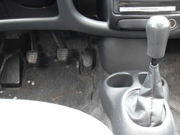 Pedal de embrague: El pedal en el lejos izquierdo. Cuando es apretado, el disco de embrague desconecta el volante y rompe la conexión entre el motor y las ruedas. Cuando se libera, el disco de embrague reenganche el volante y el motor ahora acciona las ruedas. Utiliza para paradas de corta duración y cambio de marchas. Operado con el pie izquierdo.