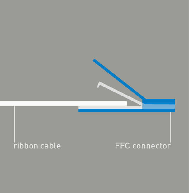 Coloque un extremo del cable de cinta entre metal prensado las partes de un conector FFC.