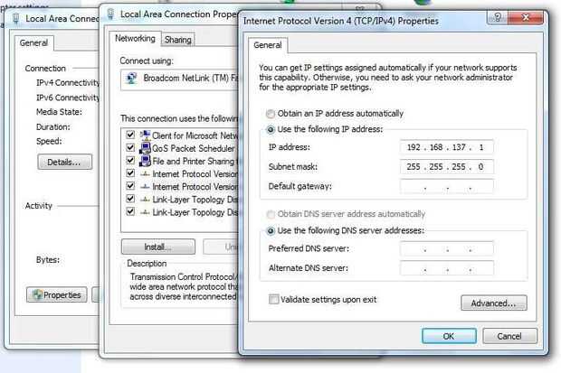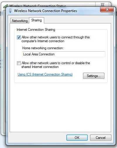Haga clic en propiedades (mostrados abajo), luego ir a compartir y haga clic en "Permitir a usuarios de otras redes conectarse". Asegúrese de que conexión de red se cambia a "Conexión de área Local":